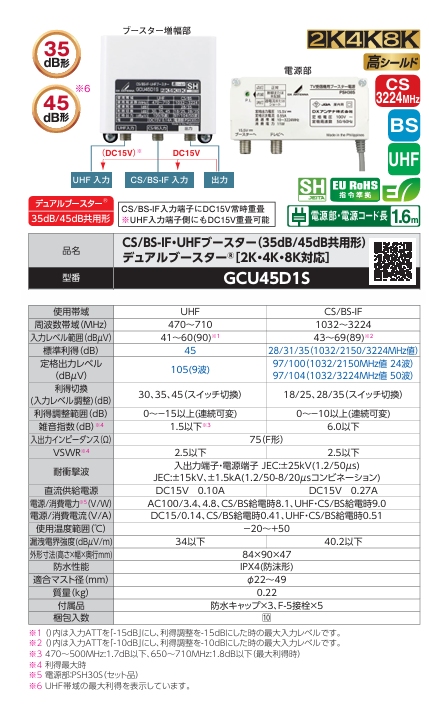 CS/BS-IF・UHFブースター 35db/45db共用型 DXアンテナ [GCU45D1S]